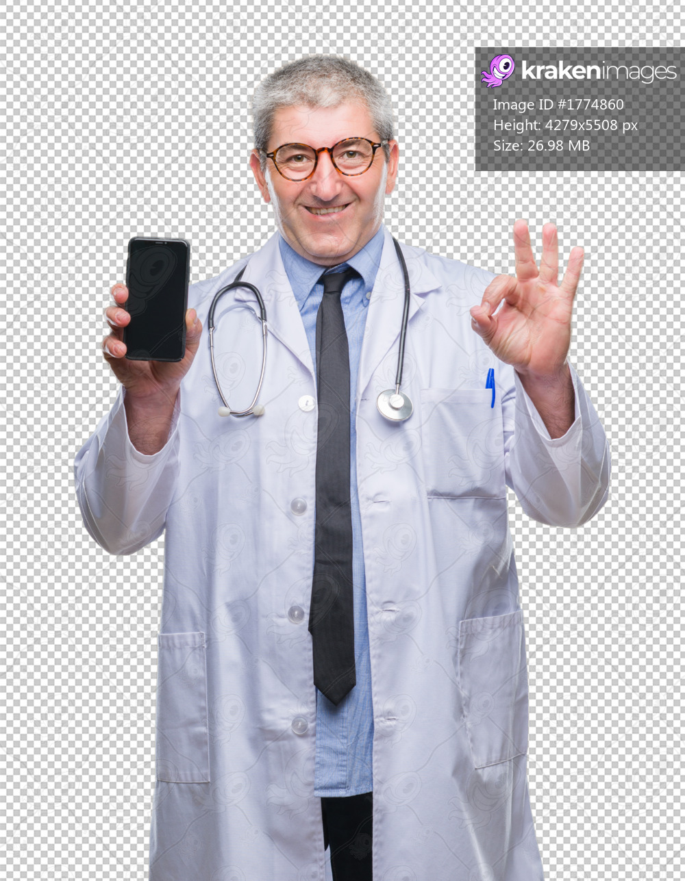Handsome senior doctor man showing screen of smarpthone over isolated background doing ok sign with fingers, excellent symbol