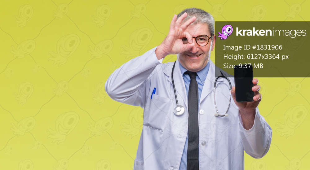 Handsome senior doctor man showing screen of smarpthone over isolated background with happy face smiling doing ok sign with hand on eye looking through fingers - Kraken Images
