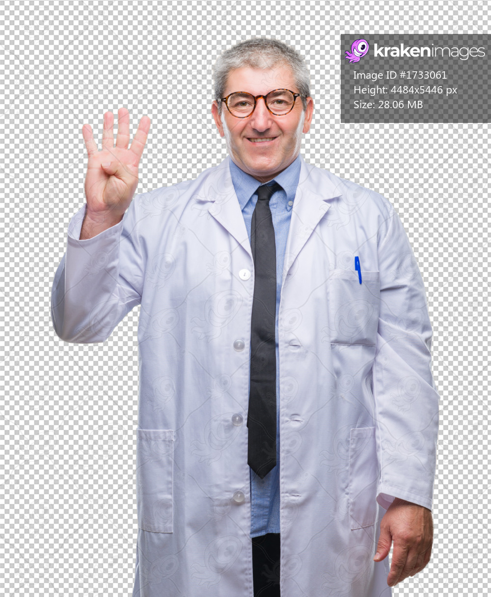 Handsome senior doctor, scientist professional man wearing white coat over isolated background showing and pointing up with fingers number four while smiling confident and happy. - Kraken Images