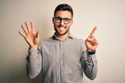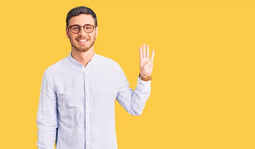 Handsome young elegant man wearing glasses smiling confident showing and pointing with fingers teeth and mouth. Health concept.