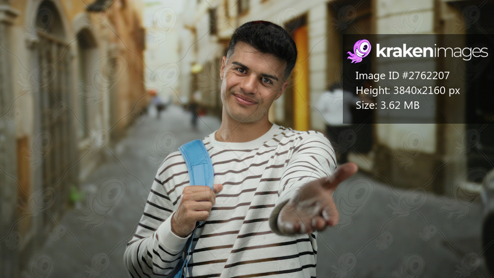 Handsome young man with striped shirt and blue backpack smiling on city street lending a hand showing friendliness and casual style amid urban backdrop. - Kraken Images