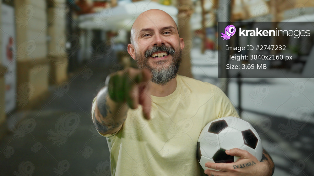 Happy bald man with beard holding soccer ball on urban street pointing at camera