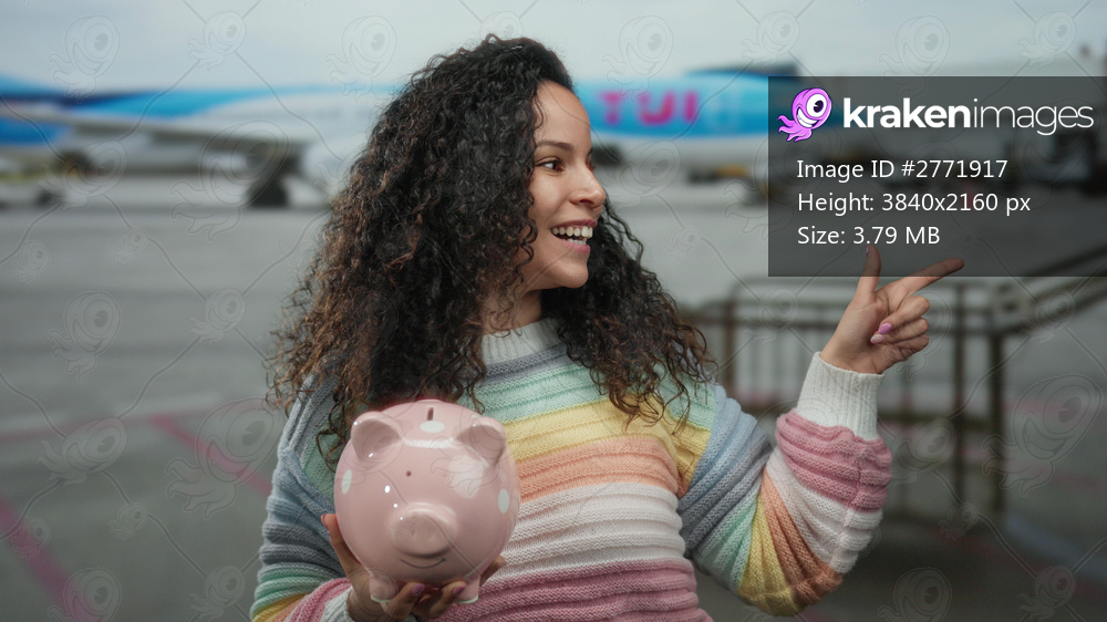 Happy hispanic woman in airport terminal holding piggy bank and pointing, with airplane in background showcasing travel savings concept.