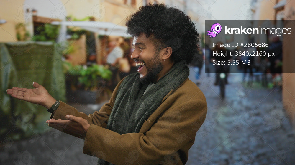 Happy man with afro hair joyfully presents something in a lively city street, offering a cheerful and inviting gesture amidst urban outdoor scenery.