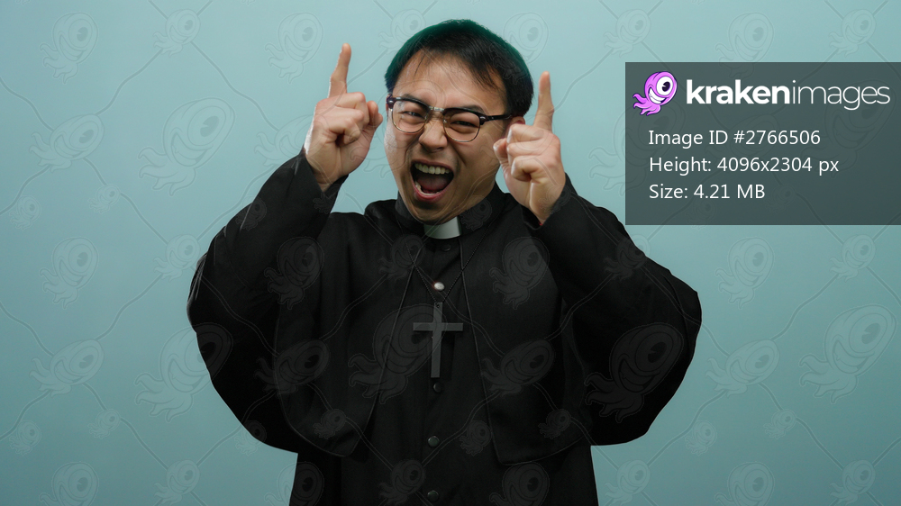 Happy man dressed as a priest smiling and pointing upwards against a blue background