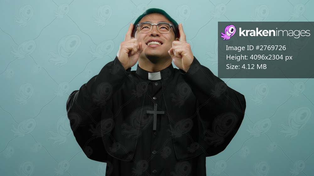 Happy man dressed as a priest smiling and pointing upwards against a blue background