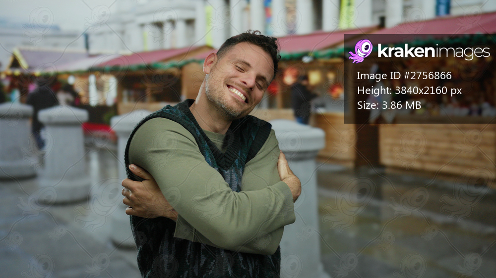 Happy man embracing moment in vibrant urban market surrounded by lively street activities and charming stalls showcasing local culture.
