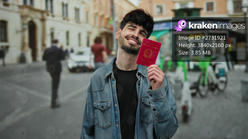 Happy man holding italian passport on a bustling urban street, showcasing travel readiness and joy in an outdoor city setting, with a bright smile and casual attire. - Kraken Images