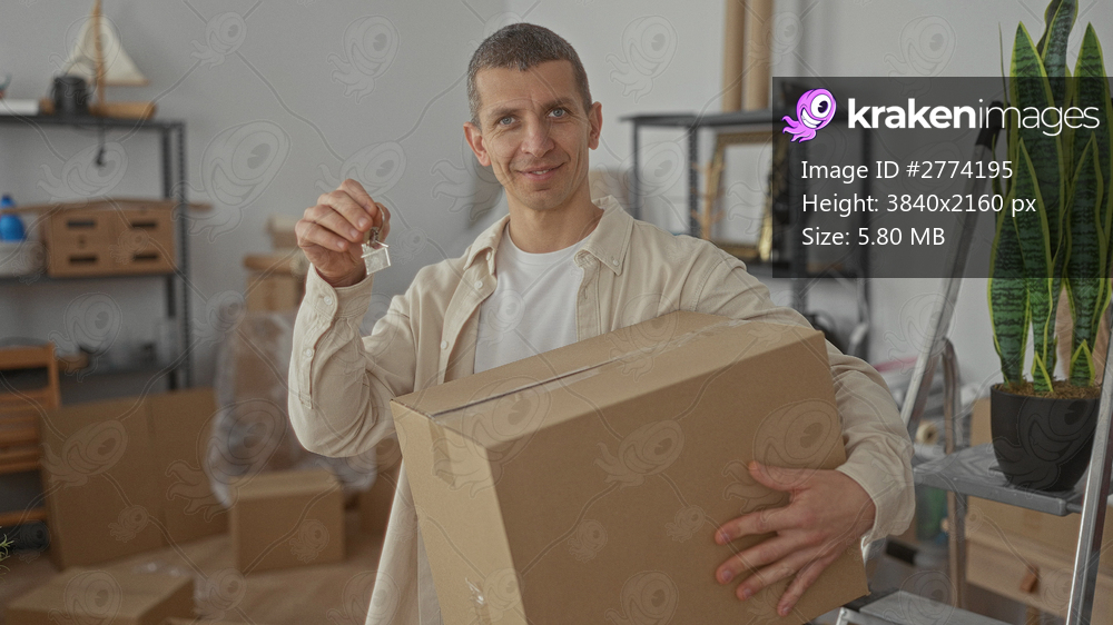 Happy man holding keys and a box in a new living room, symbolizing moving day and fresh beginnings in a bright, modern apartment filled with unpacked cardboard boxes and shelves. - Kraken Images