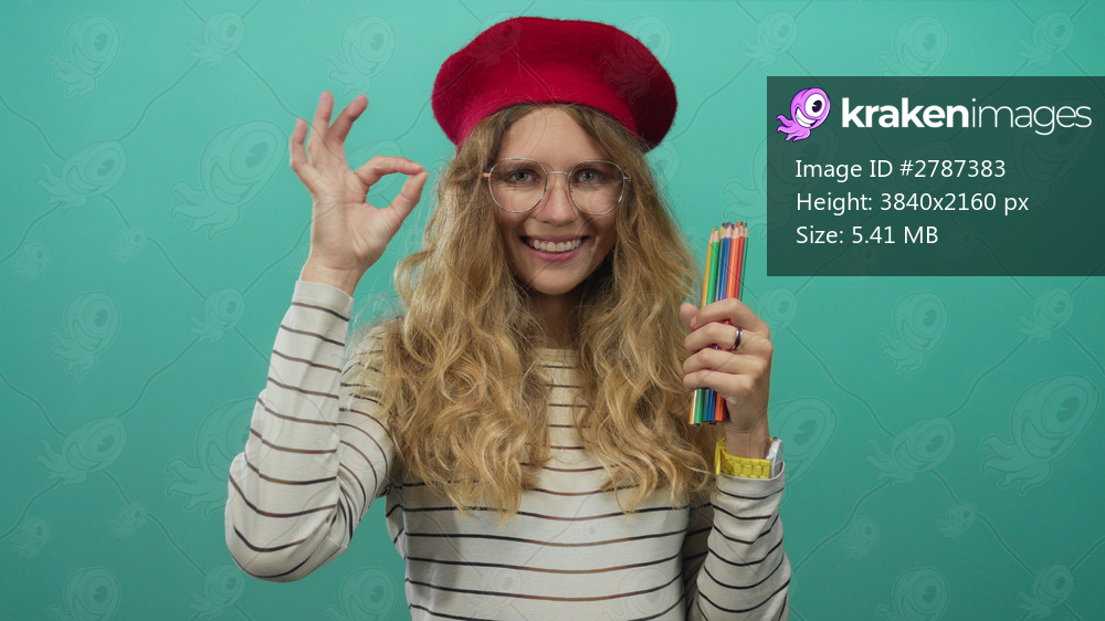 Happy woman shows hand ok gesture in a bright studio in an indoor space with blonde young artist wearing a striped top and glasses while holding colored pencils. - Kraken Images