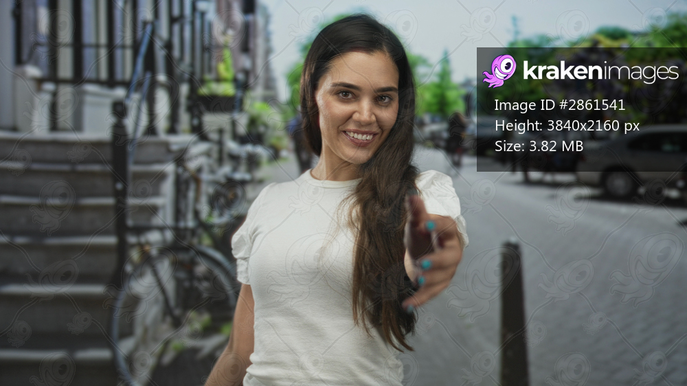 Happy young hispanic woman extends bare hand for warm handshake in busy city street; trust connection.