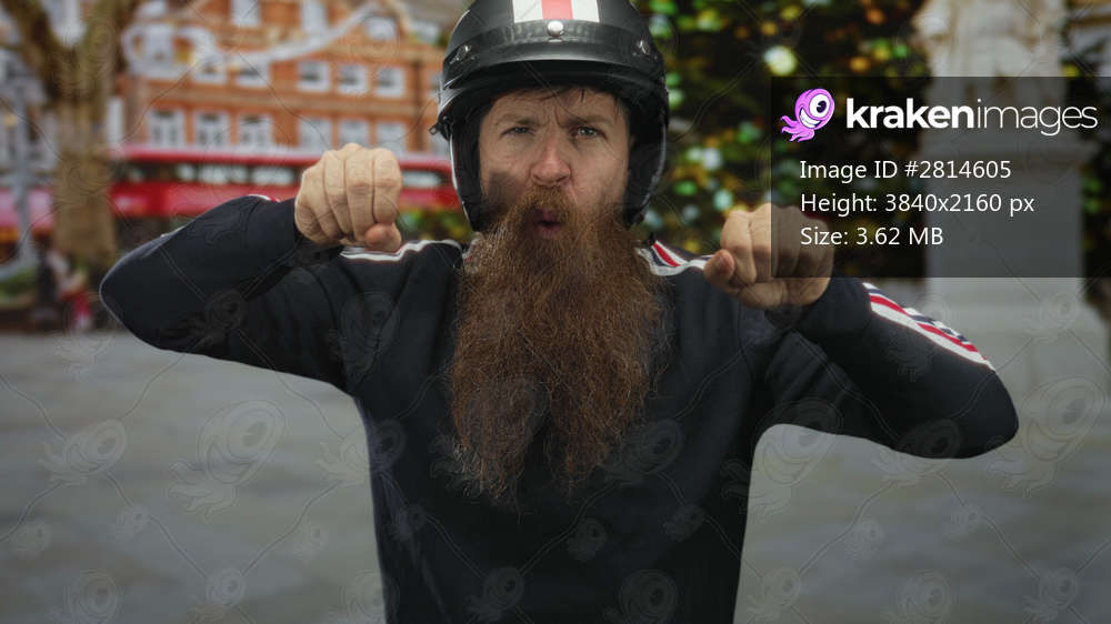 Helmeted bearded man mimes gripping handlebars in motorcycle riding gesture on street with blurred city buildings; adventure.