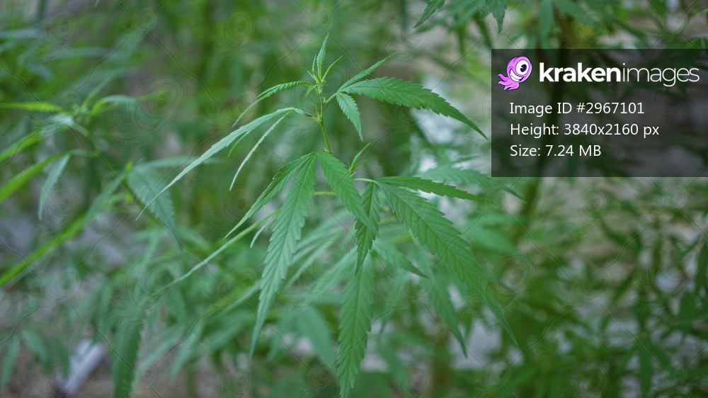 Hemp plant with long serrated leaves swaying among thin stems beside a building wall, green foliage filling the frame; tranquility.