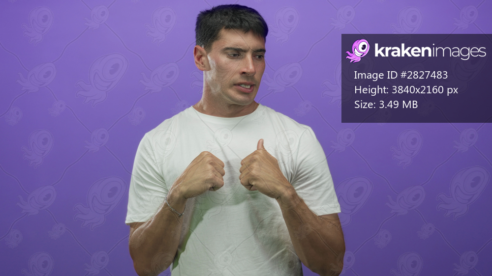 Hispanic athletic man clenches fists exposing bare sweaty forearms in purple studio setting; anxiety.