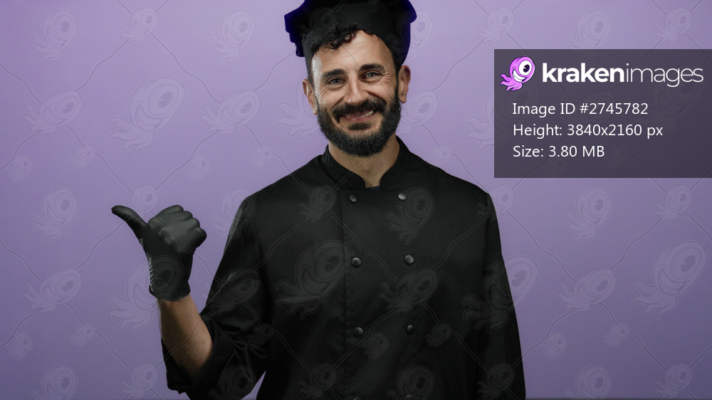 Hispanic bearded chef in black attire smiles against a vibrant purple backdrop, conveying a sense of culinary pride and inviting warmth with a thumbs-up gesture. - Kraken Images
