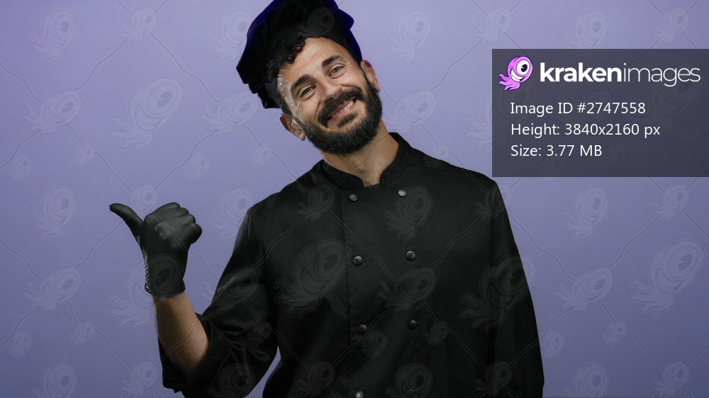 Hispanic bearded chef man in black uniform and gloves smiling confidently with thumbs up against a vibrant purple background showcasing professionalism in culinary arts. - Kraken Images