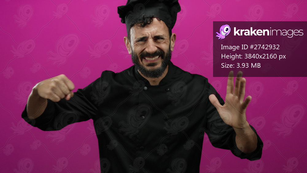 Hispanic bearded man chef gesturing aggressively in black uniform against a vibrant pink background portraying frustration and emotion.
