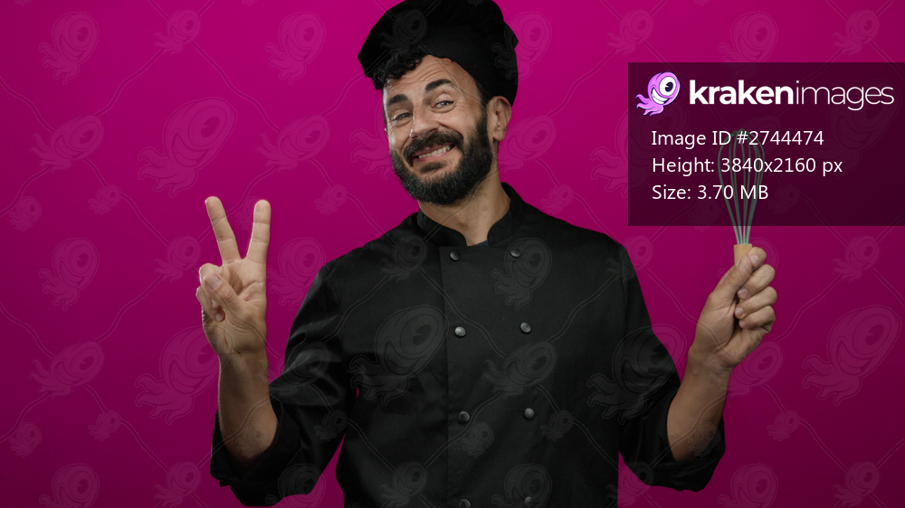 Hispanic bearded man chef smiling in black uniform holding whisk on a vibrant pink background, gesturing peace with both hands, embodying joyful cooking spirit. - Kraken Images