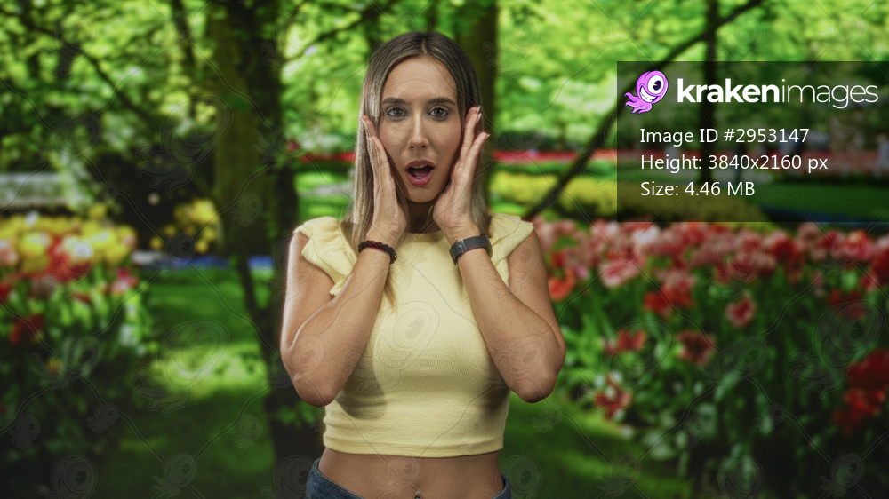 Hispanic blonde woman with hands to cheeks in forest park among tulips and trees, open mouth expression; surprise discovery.