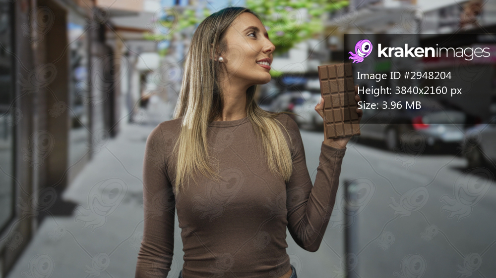 Hispanic blonde woman holding chocolate bar aloft with right hand on a busy city street, smiling and looking sideways while wearing a brown long sleeve top; indulgence joy. - Kraken Images