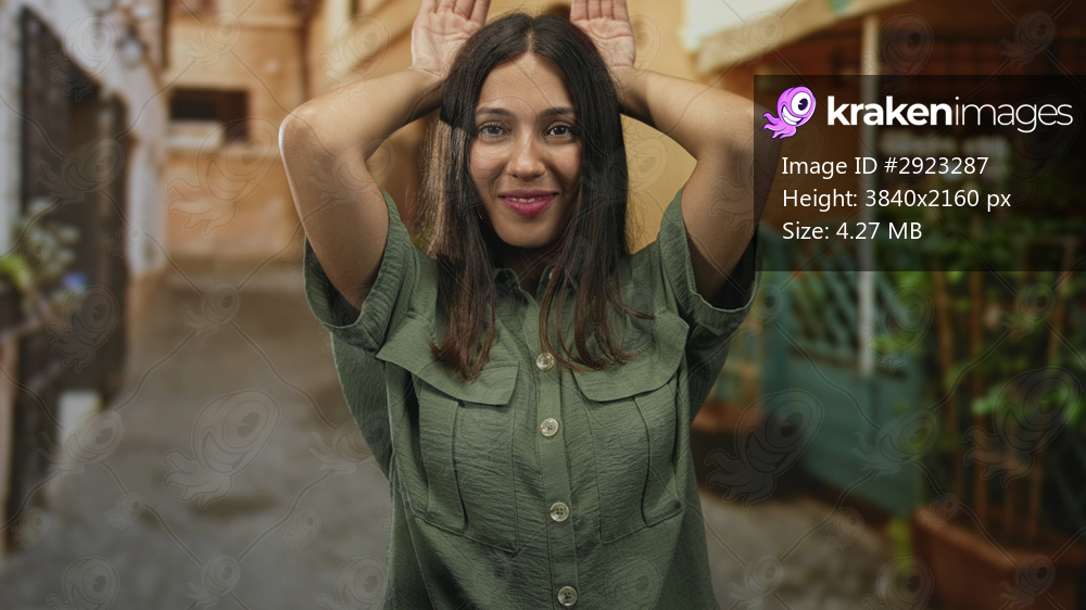 Hispanic brunette woman with hands on head posing on narrow street in green shirt, smiling with tongue out and playful expression; playful joy.