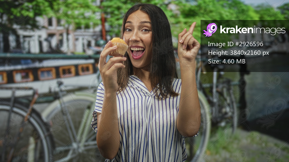 Hispanic brunette woman holding a cupcake and points finger up on amsterdam street by canal and bicycle; joy travel food.