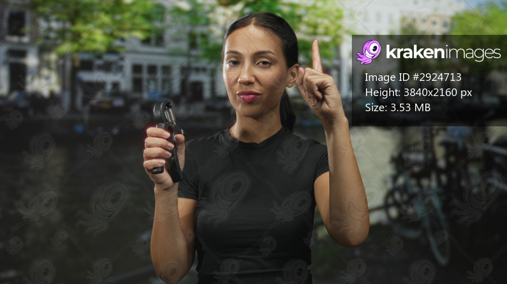 Hispanic brunette woman holding a handgrip exerciser and finger pointing up on a street by an amsterdam canal, bicycles beside her; confidence empowerment concentration. - Kraken Images