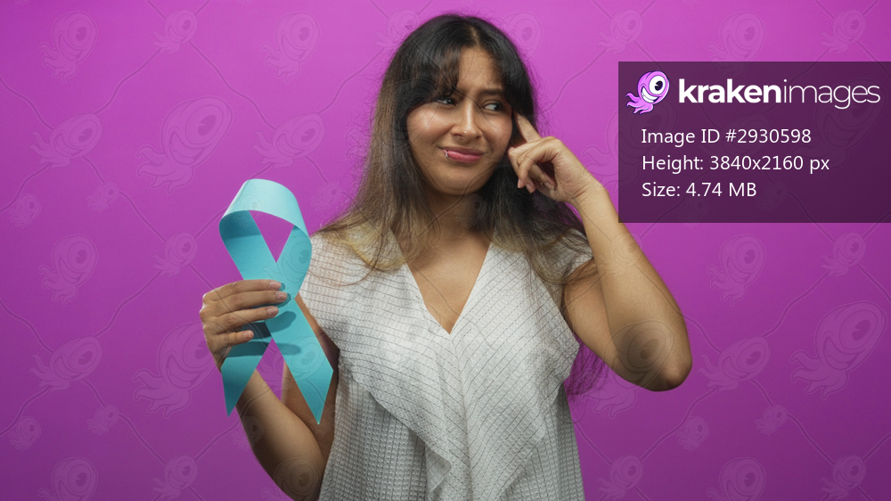 Hispanic brunette woman holding teal awareness ribbon and pointing finger to temple in studio on magenta backdrop; health awareness concern.