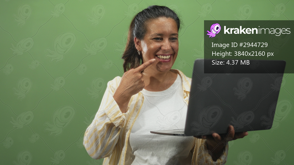 Hispanic brunette woman middle age smiles and points finger to her teeth while holding laptop with one hand in studio with green backdrop and casual striped shirt; joyful connection. - Kraken Images