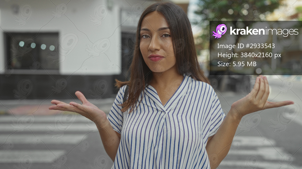 Hispanic brunette woman shrugging with palms up on a city street crosswalk, wearing blue and white striped blouse and shoulder bag; indifference.