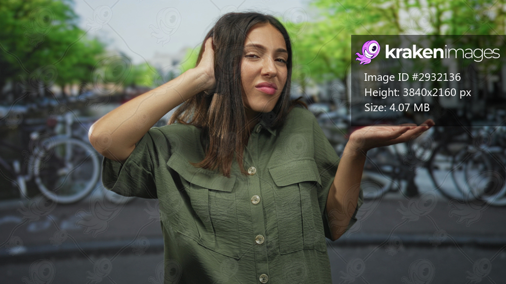 Hispanic brunette woman touching her head and shrugging palm up beside parked bicycles on a street in amsterdam; annoyance.