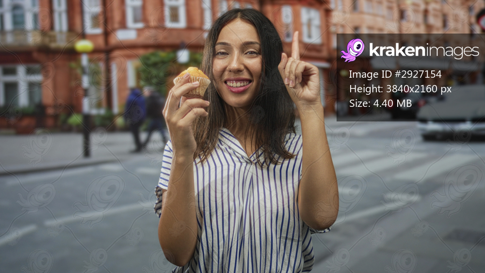 Hispanic brunette young woman holding a muffin in one hand points finger up on a city street crosswalk while smiling broadly; joy.