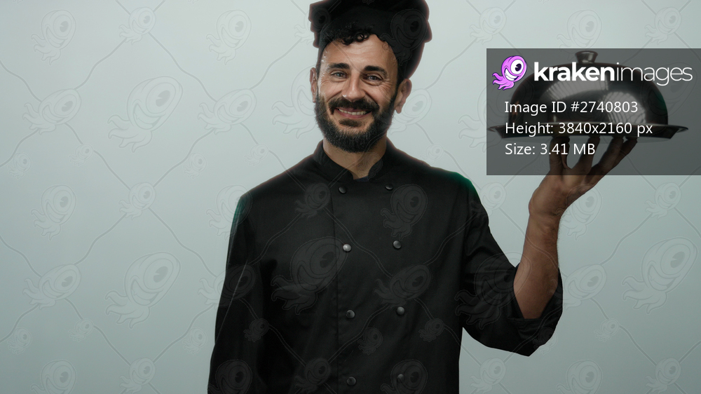 Hispanic chef man with a beard smiling while holding a silver tray against a grey background in a professional kitchen setting.