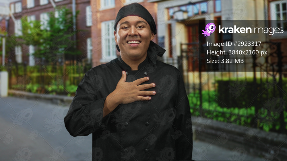 Hispanic chef man wearing black jacket with hand on chest at building entrance on street, smiling broadly; sincere gratitude.