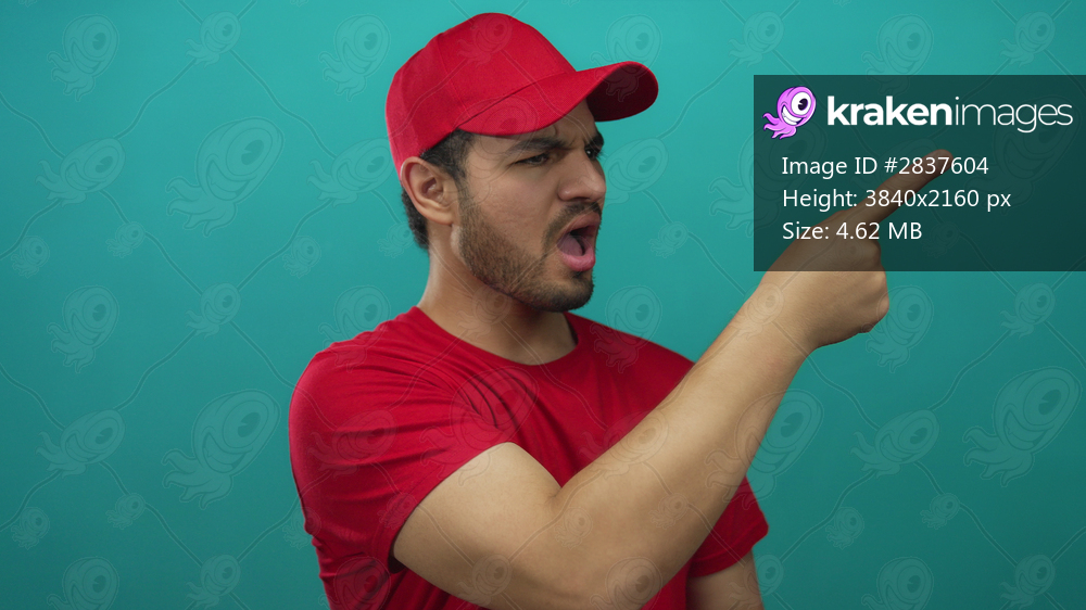 Hispanic courier man with furrowed brow points finger in studio setting wearing red cap and shirt; urgency.