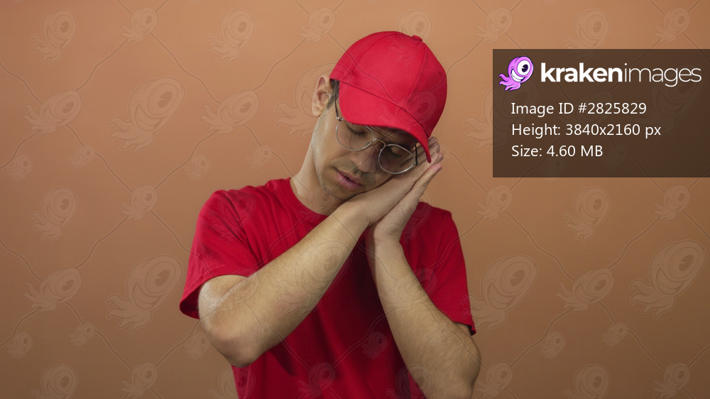 Hispanic courier man wearing red cap presses hands to cheek in studio with orange background; sleepiness.