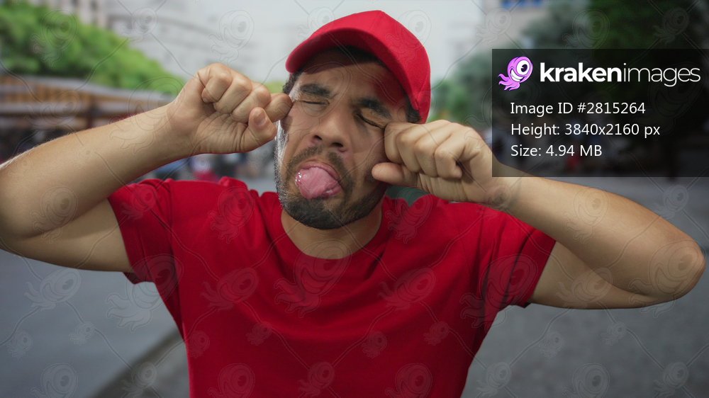 Hispanic delivery courier man pulls his cheeks with tongue out in red cap and shirt at outdoor street market with souvenir stalls; playfulness.