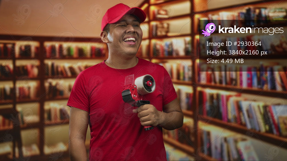 Hispanic delivery worker holding tape dispenser and smiling while packing books in a library building; cheerful service.