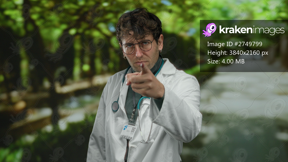 Hispanic doctor in park makes watchful gestures, wearing white coat and stethoscope under lush green canopy, conveying vigilance calmly yet assertively. - Kraken Images