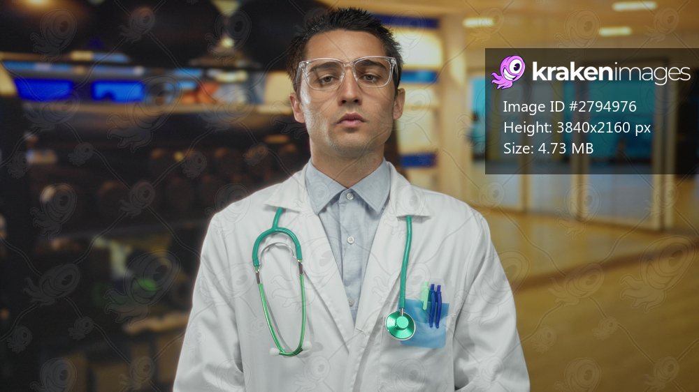 Hispanic doctor wearing a uniform and stethoscope stands confidently indoors at a gym, blending healthcare and fitness elements in a professional sports center setting. - Kraken Images