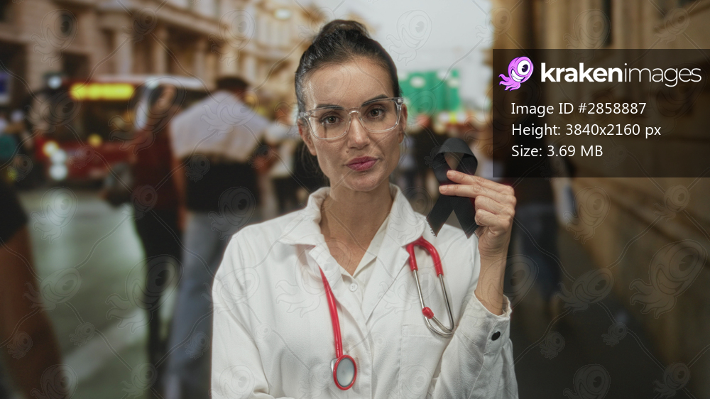 Hispanic doctor wearing glasses and stethoscope holds black ribbon between fingers on crowded street; solidarity awareness.