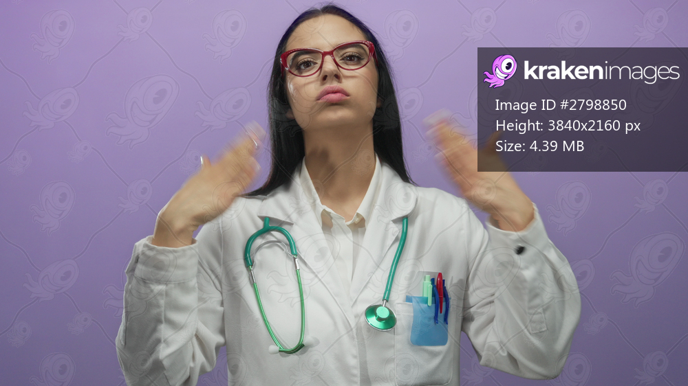 Hispanic female doctor with a stethoscope cools herself with her hands in front of a purple wall, wearing glasses and a white uniform, expressing heat discomfort. - Kraken Images