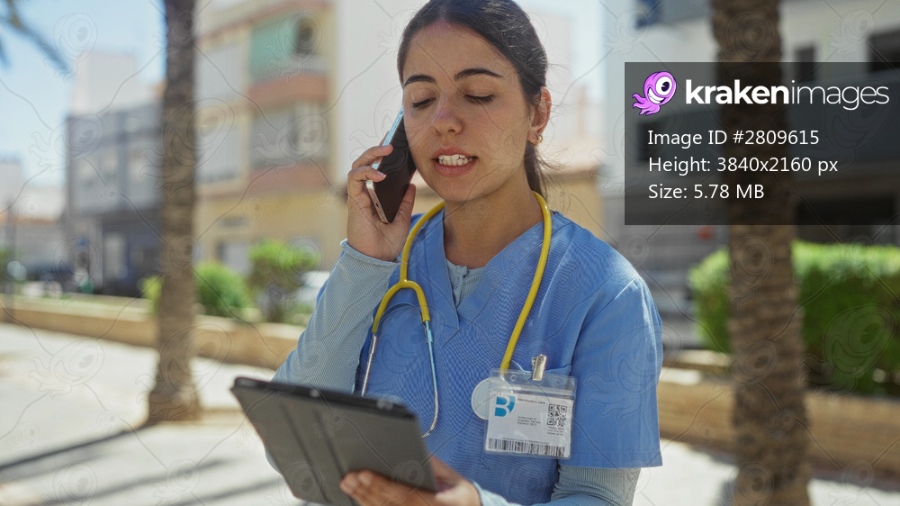 Hispanic female doctor in uniform with stethoscope talks on smartphone and uses tablet on street, showcasing technology and healthcare in urban setting. - Kraken Images