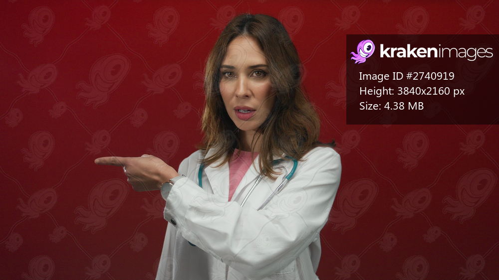 Hispanic female doctor in white coat and stethoscope gestures angrily pointing against vivid red background, embodying frustration and authority in a medical setting. - Kraken Images