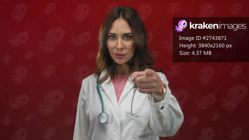 Hispanic female doctor in white coat and stethoscope gestures angrily pointing against vivid red background, embodying frustration and authority in a medical setting. - Kraken Images