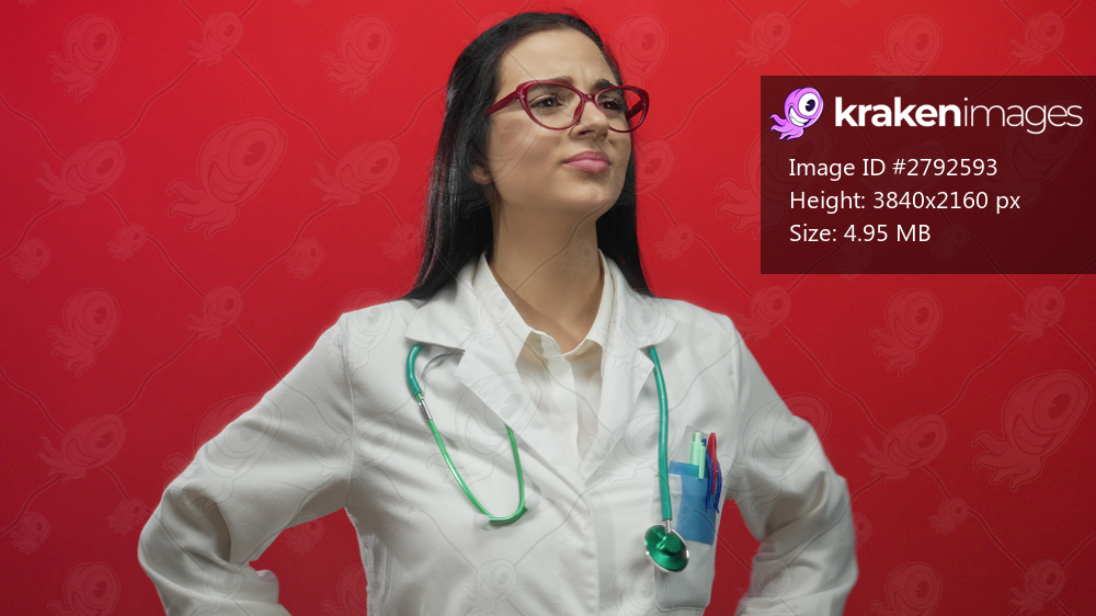 Hispanic female doctor wearing glasses and stethoscope stands confidently against a vibrant red wall background, expressing determination and professionalism in her white uniform. - Kraken Images