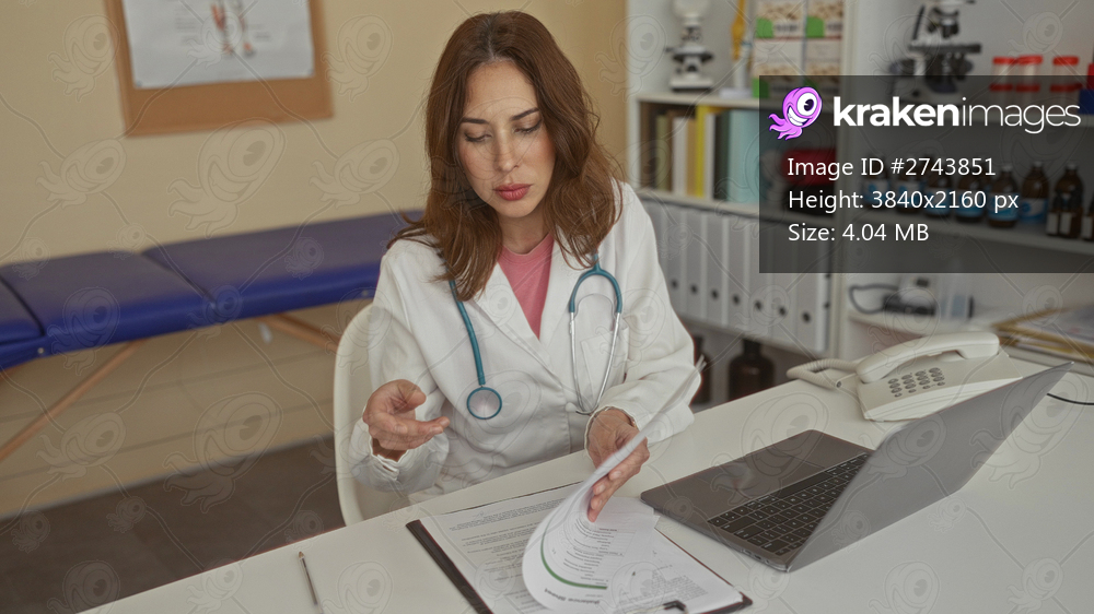 Hispanic female doctor working with laptop and paperwork in a clinic room, surrounded by medical equipment, showcasing a professional healthcare setting. - Kraken Images