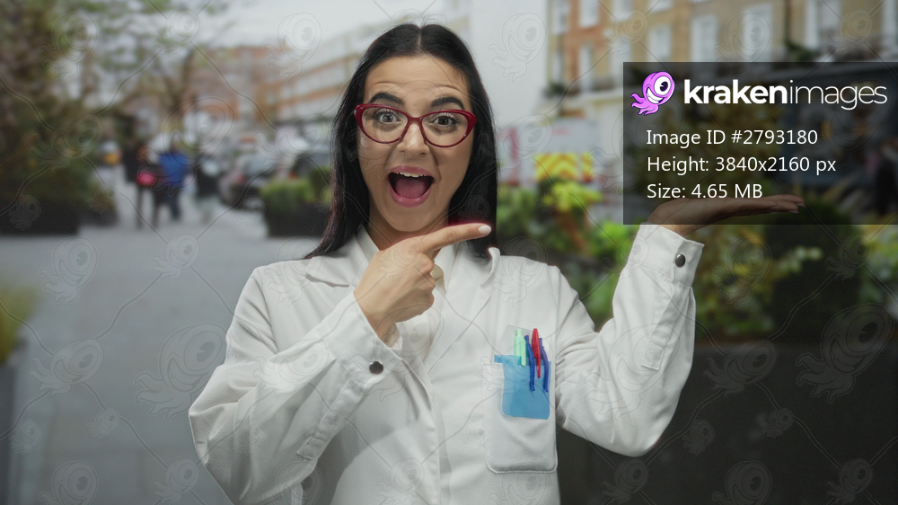 Hispanic female scientist in uniform making an ok sign on a bustling city street, showcasing confidence and positivity in an urban environment.