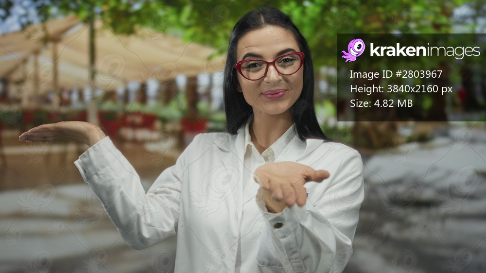 Hispanic female scientist presenting in an outdoor street scene with vibrant trees and an elegant uniform, showcasing a professional yet approachable demeanor in a natural environment. - Kraken Images