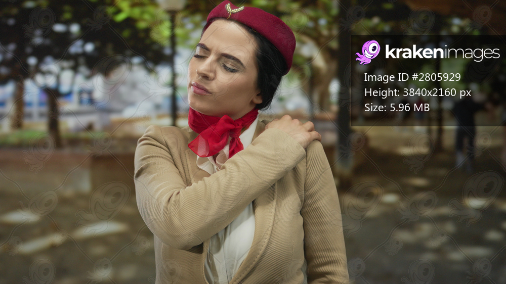 Hispanic flight attendant in uniform massages her neck while standing in a sun-dappled park, expressing discomfort amidst an outdoor setting under tree shade. - Kraken Images